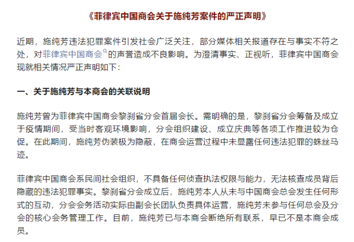 施纯芳被抓获回国后,菲律宾中国商会发表声明称,“施纯芳伪装极为隐蔽,在商会运营过程中未显露任何违法犯罪的蛛丝马迹”,该商会同时表示,“菲律宾中国商会系民间社会组织,不具备任何侦查执法权限与能力,无法核查成员背后隐藏的违法犯罪事实”“目前,施纯芳已与本商会断绝所有联系,早已不是本商会成员”。
