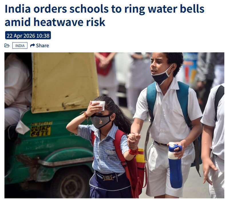 《印度时报》《印度斯坦时报》等媒体4月22日报道称,印度教育部发布指令,要求学校每45分钟至60分钟打响“喝水铃”,督促学生及时补水,同时推行同伴互助机制,引导学生相互照顾,以应对热浪。此外,学校还需加强防暑补水宣传教育,缩减户外活动,避免在露天场地集会与授课。